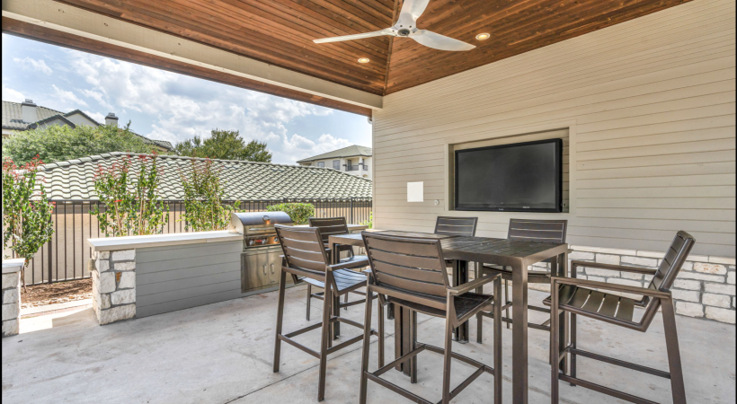 • a patio with grills, tables and chairs