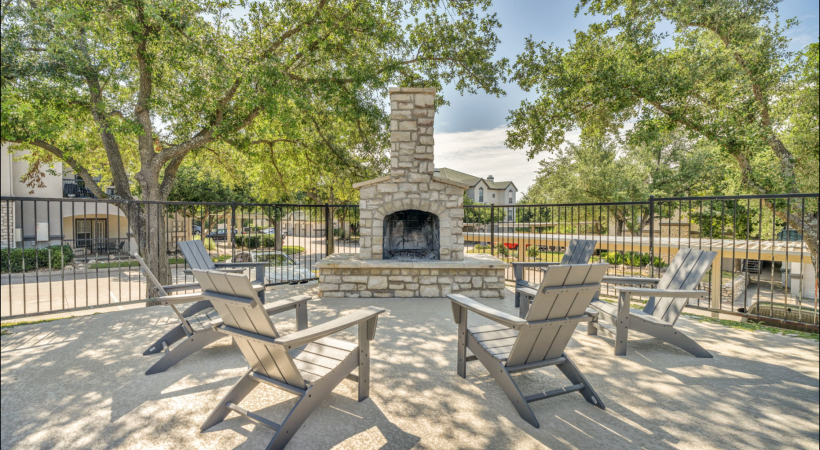 • a patio with a fireplace and chairs