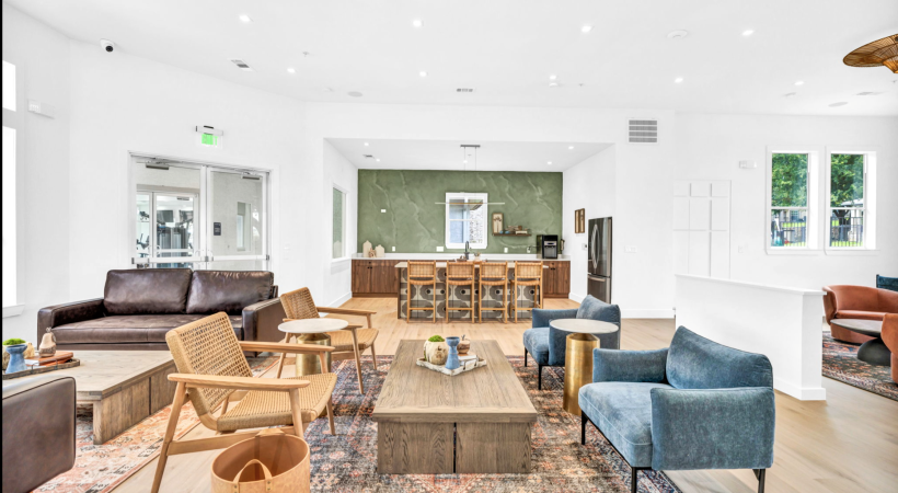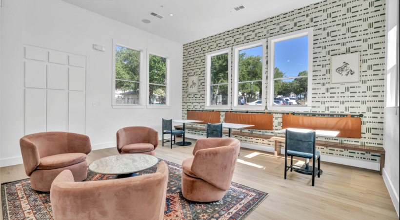 a leasing office with chairs and benches